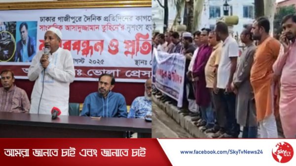 নিজস্ব প্রতিবেদকঃ ঢাকার গাজীপুরের সাংবাদিক দৈনিক প্রতিদিনের কাগজ গাজীপুর প্রতিনিধি আসাদুজ্জামান তুহিনকে নিশংসভাবে হত্যার প্রতিবাদ ও খুনিদের দৃষ্টান্তমূলক শাস্তির দাবি করে মানববন্ধন ও প্রতিবাদ সভা অনুষ্ঠিত হয়েছে। ৮ আগস্ট শুক্রবার